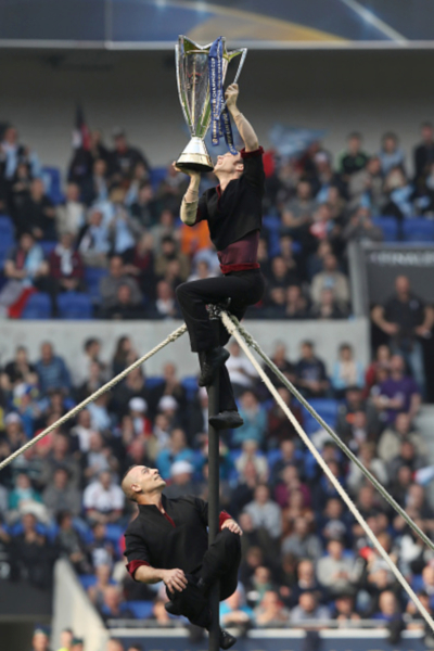 7 minutes d’ouverture, avant la finale de la coupe d’Europe de rugby où se mélange danse urbaine, acrobaties, main à main et mât chinois. Autour du mât chinois, huit acrobates évoluent en question réponse, ensemble ou de manière désynchronisée sur une musique live.