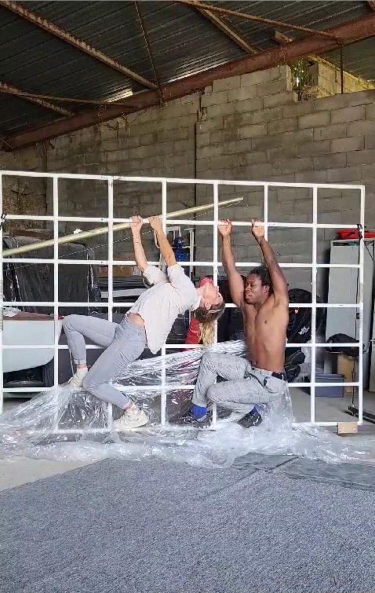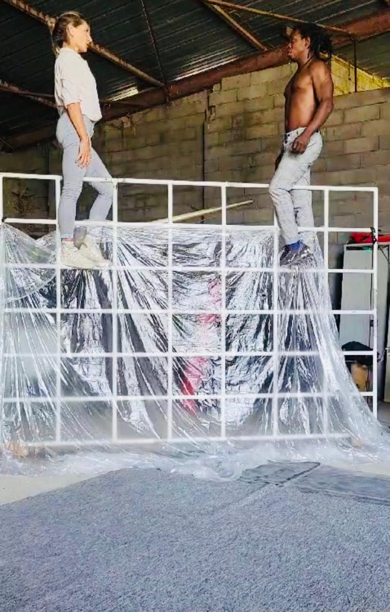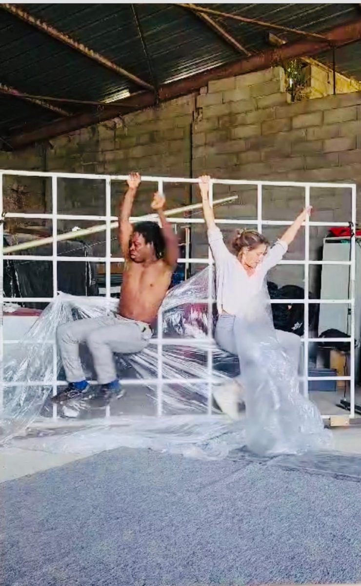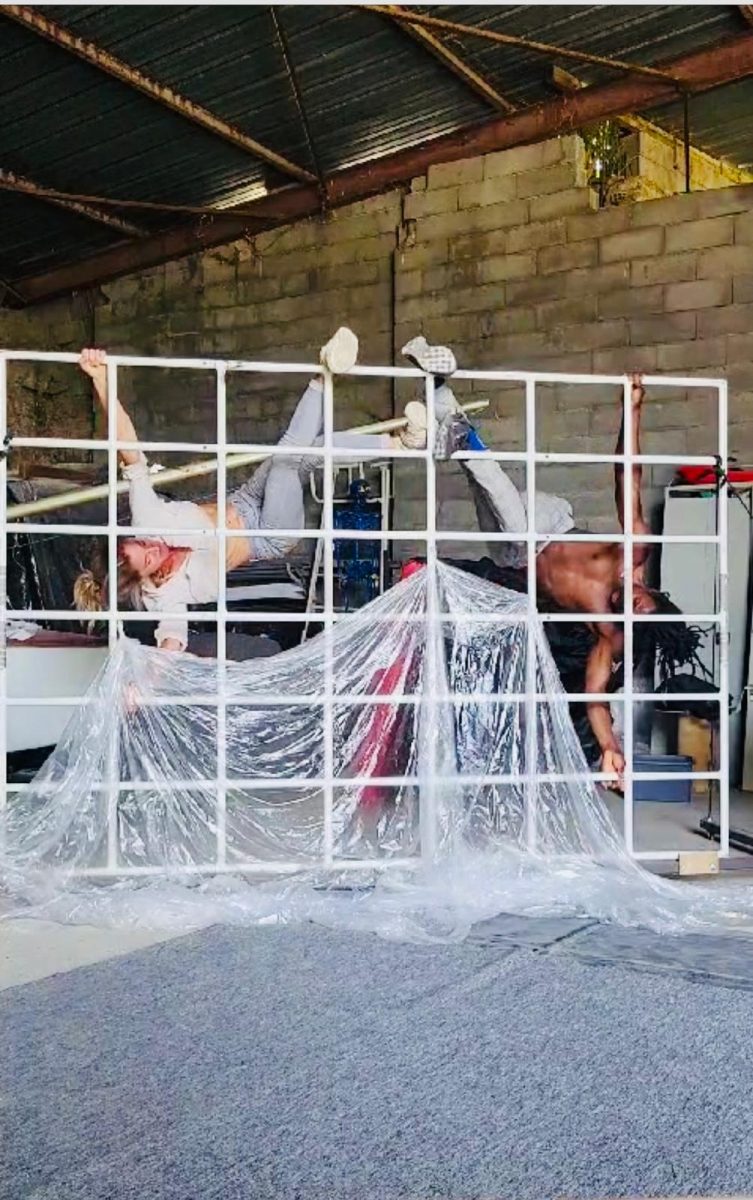 Trapèze, tissu, grille, peinture live : Caroline Siméon